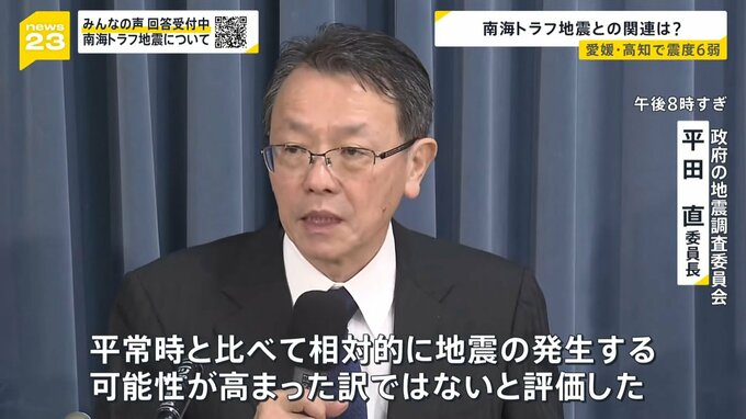 「そもそも南海トラフでは、いつ地震が起きても、巨大な地震が起きても不思議ではない状態であることは改めて思い出していただいて、十分に注意していただきたい」