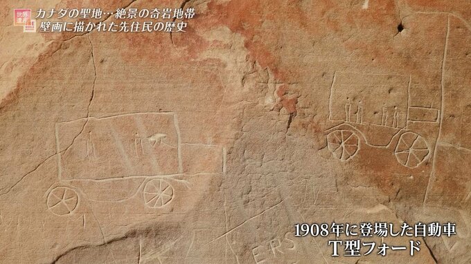 車輪がある箱形の乗り物…自動車です。それも1908年に登場したT型フォード。実は20世紀初めまで壁画は描かれ続けてきて、ブラックフットは「自動車を目にした衝撃」を絵という形で遺したのです。