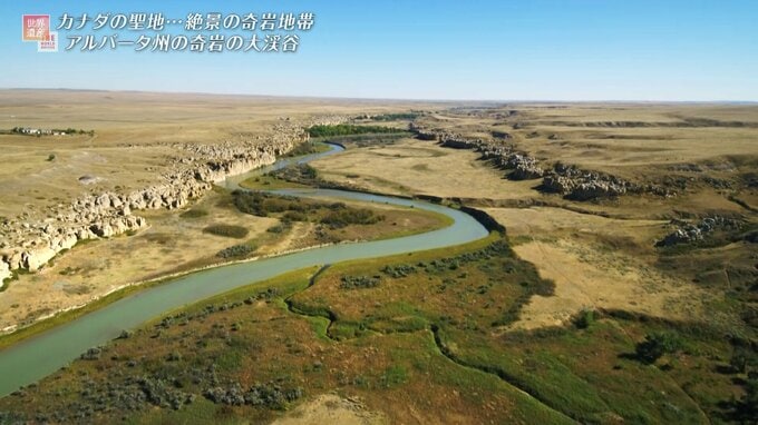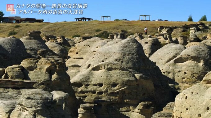カナダの世界遺産「ライティング・オン・ストーン」。アルバータ州の渓谷沿いに広がっている州立公園ですが、断崖の上にキノコのような奇岩が林立する不思議な場所です。