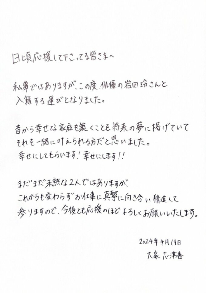 大家さんは直筆のコメントを寄せており、岩田さんを「昔から幸せな家庭を築くことも将来の夢に掲げていて それを一緒に叶えられる方だと思いました。」と表現しています。そして「幸せにしてもらいます!幸せにします!!」と宣言しています。