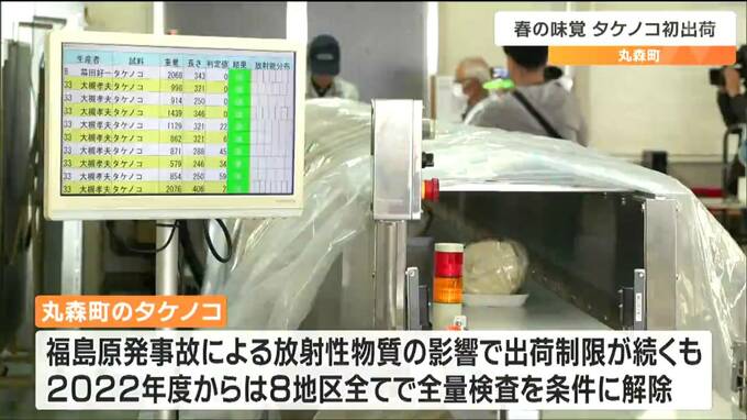 丸森町のタケノコは福島原発事故による放射性物質の影響で出荷制限が続きましたが、2022年度からは8つある地区すべてで全量検査を条件に出荷制限が解除されています。きょうの検査でも放射性物質は検出されませんでした。