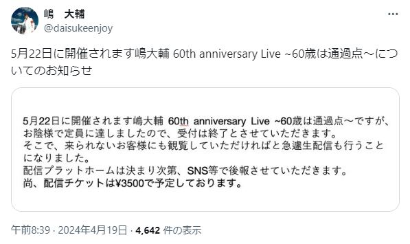 19日、嶋大輔さんが自身のXで、60名限定ライブが定員に達したため受付を終了することを報告。さらに生配信を行うことも知らせました。