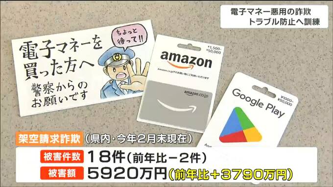電子マネーを購入させる手口は架空請求詐欺で使われることが多くなっています。今年2月末現在、県内での被害件数は18件と前年に比べ2件減っているものの、被害額は5920万円と2倍以上に増えています。