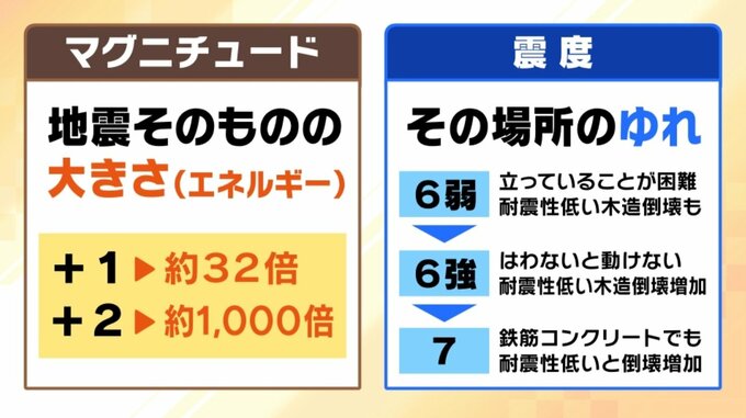 これに対して「震度=その場所の揺れ」のことで、▼震度6弱=立っていることが困難、耐震性の低い木造は倒壊も ▼震度6強=這わないと動けない、耐震性の低い木造倒壊が増加 ▼震度7=鉄筋コンクリートでも耐震性が低いと倒壊増加 など被害の目安が示されています。