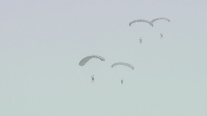 嘉手納基地では19日、午後1時半ごろからおよそ1時間半かけて、20人の兵士がパラシュートを使って滑走路に降下する様子が確認されました。