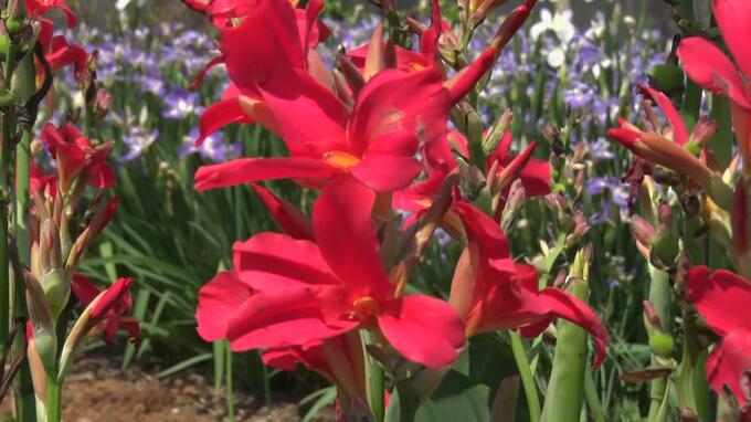うるま市石川山城の沖縄紅茶農園に広がるこちらの花畑。農園の山城ミツ子さんが2年前から手入れを続けていて、およそ600坪の花畑には真っ赤なカンナやアヤメ科のオクラレルカなど色とりどりの花々が咲き誇っています。