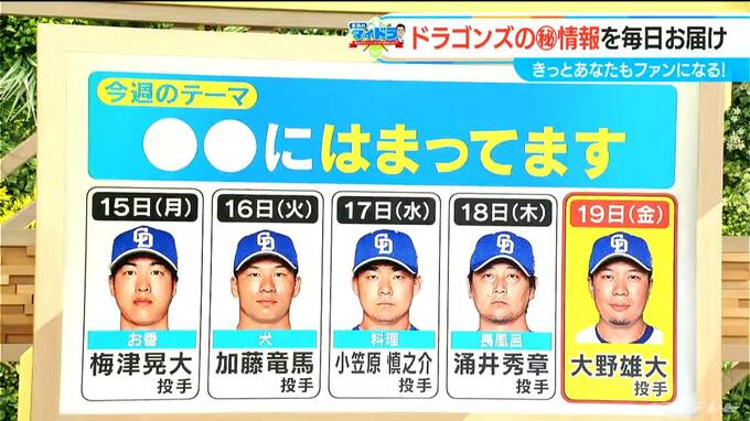 今週のテーマは〇〇にはまっていますということで、15日(月)の梅津晃大投手は「お香」、加藤竜馬投手は「犬」、小笠原慎之介投手は「料理」、涌井秀章投手は「長風呂」。そして、きょう(19日)は大野雄大投手です。