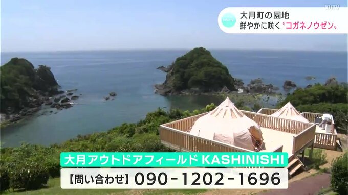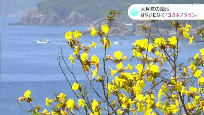 大月町樫ノ浦、海を望む高台の『樫西園地』では南米原産の「コガネノウゼン」が鮮やかな黄色い花を咲かせています。ブラジルの“国の花”で、日本でいうサクラのように親しまれているというコガネノウゼン。園地全体で数十本植えられている木のうち、坂の遊歩道沿いではまさに今、黄色い花々が青い空や海に映えています。