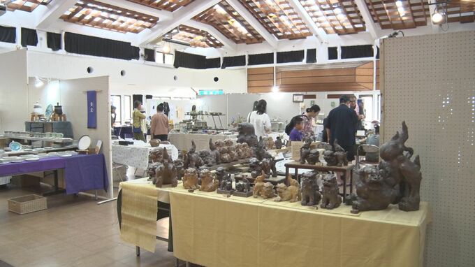 大宜味村で開かれた「いぎみてぃぐま展」では、芭蕉布で織られた着物や陶芸・漆器など、大宜味村内にある20の工房が制作した手作りの作品が展示・販売されていて、誰でも参加できる作品のオークションも開かれました。