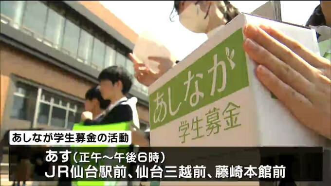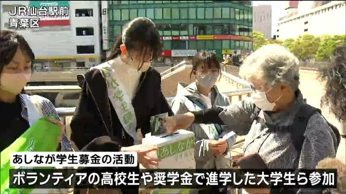 JR仙台駅前など市内3か所であしなが学生募金の活動を行ったのは、ボランティアの高校生や奨学金で進学した大学生などです。集められたお金は、病気や災害などで親を亡くした子どもや親が障害を持つ子どもの奨学金に充てられます。