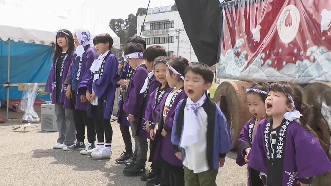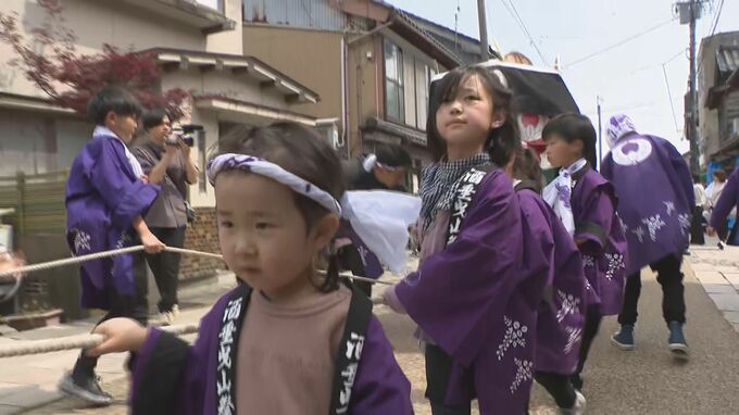 地震の影響で「ちょんこ山」と呼ばれる子ども用の小さな曳山のみが巡行しましたが、町には子どもたちの元気な声が響きました。