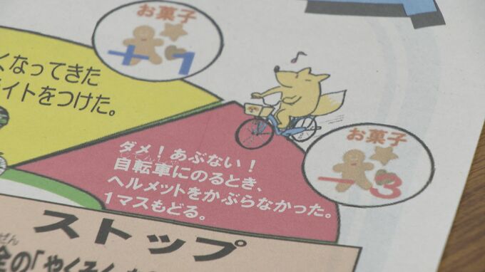 ルーレットで出た数のマスを進んでいきますが、「手をあげて横断歩道を渡った」「信号がチカチカしていたので横断歩道の手前で止まった」など、安全な行動をするマスに止まるとお菓子がもらえ、反対に「道路をななめに歩き車とぶつかりそうになった」「自転車に乗る時にヘルメットをかぶらなかった」など危ない行動のマスに止まるとお菓子を失います。
