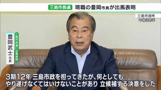 次期市長選に向けて現職の出馬表明です。静岡県の三島市の豊岡市長と富士宮市の須藤市長が8月2日、それぞれ会見を開き、市政への意気込みを語りました。<三島市 豊岡武士市長>「3期12年三島市政を担ってきたが、…