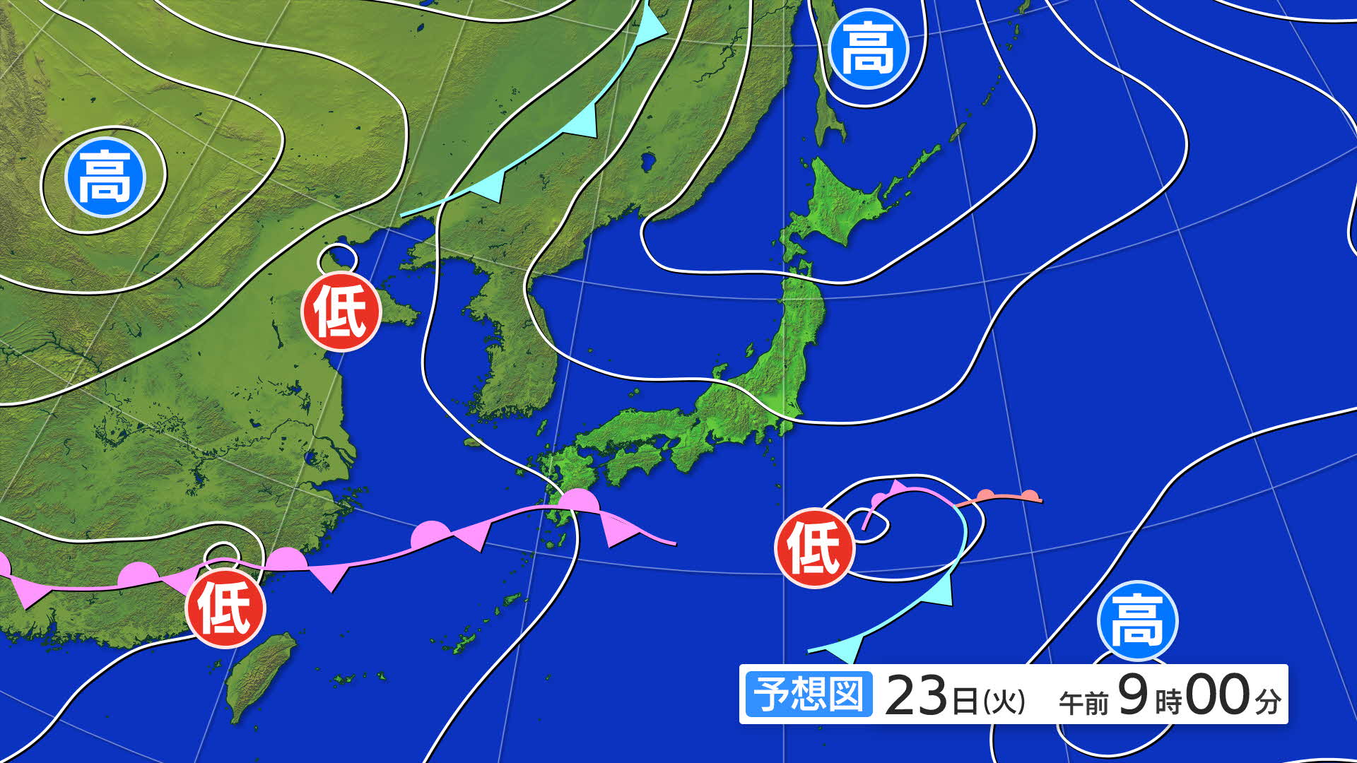 23日火曜日は関東の南の海上を通る低気圧は遠ざかりますが、午前9時の予想天気図を見ると九州南部では前線が盛り上がったような状態になっています。
