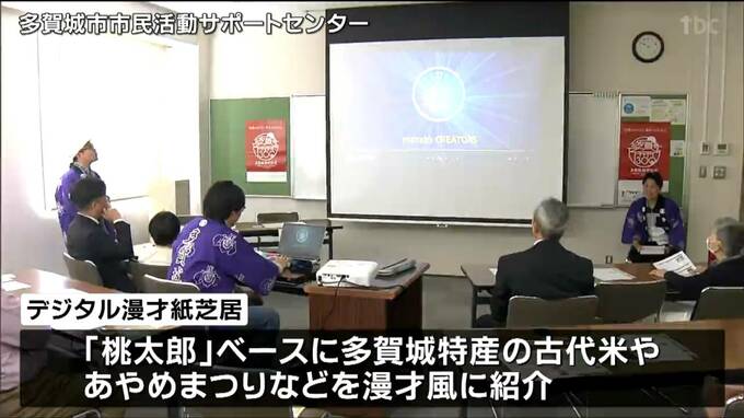 関係者らにお披露目された作品は、昔話の「桃太郎」をベースに多賀城特産の古代米やあやめ祭りなど地元の見どころをボケとツッコミを織り交ぜた漫才風に紹介しています。