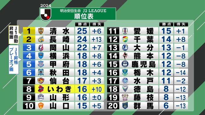 いわきは3試合ぶりの勝利で8位に浮上。プレーオフ圏内の6位との勝ち点差は2で、上位進出を狙える位置につけています。