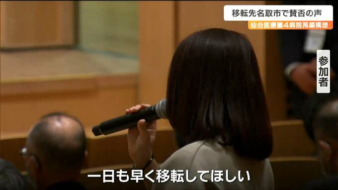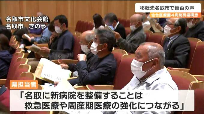 宮城県が進める仙台医療圏の4病院再編構想で、新病院の設置先となっている名取市で21日、住民を対象にした説明会が初めて開かれました。住民からは新病院に期待する声が聞かれる一方、県の進め方に厳しい意見も上がりました。