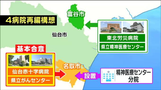 仙台医療圏の4病院再編構想のうち、仙台市太白区の赤十字病院と名取市の県立がんセンターを統合して名取市に移転することについては、すでに基本合意が結ばれています。また、名取市には精神医療センターの分院を置く構想になっています。