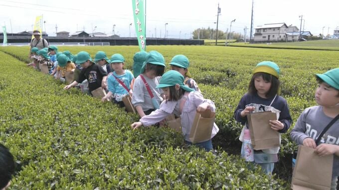 愛知県内2位の茶葉生産地の豊田市で、子どもたちが茶摘みを体験しました。4月22日、子どもたちの茶摘みが行われたのは豊田市豊栄町の茶畑で、近くの2つのこども園の園児約100人が参加しました。子どもたちは長さ4…