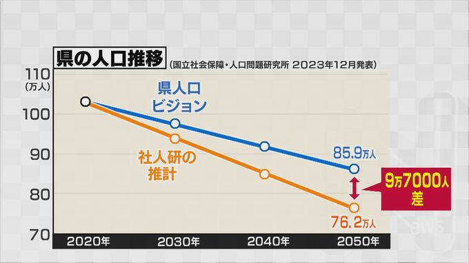 国立社会保障・人口問題研究所の人口推計では富山県の人口は2050年に76万2000人まで減る見込みですが、県が策定した人口ビジョンでは85万9000人となっていて、9万7000人分のずれが生じています。