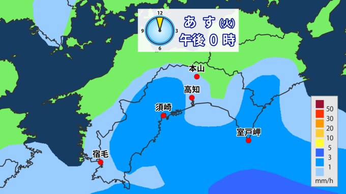 朝から雨雲が県内に広くかかり、午後になると本降りとなる見通しです。東部は低気圧が接近する夜に雨が強まりそうです。室戸岬では24時間で200ミリ弱が予想されており、これは4月1か月分の雨量に相当します。雨の降り方に注意してください。また、先週の地震の影響で地盤が緩んでいる宿毛などの西部では土砂災害に厳重な注意が必要です。