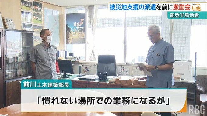 激励会では前川土木建築部長が「慣れない場所での業務になるが、健康に気をつけて被災地の復旧・復興に貢献してほしい」と言葉を送りました。