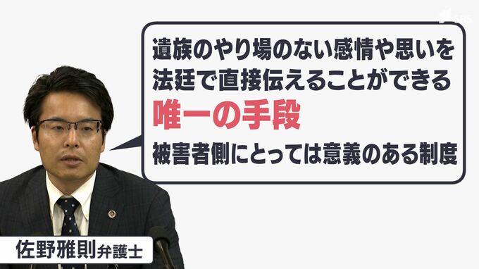 この被害者参加制度ですが、刑事事件を扱うことが多い佐野雅則弁護士によりますと、遺族のやり場のない感情や思いを法廷で直接伝えることができる唯一の手段で 被害者側にとっては意義のある制度だといいます。