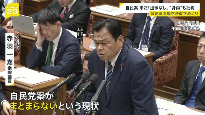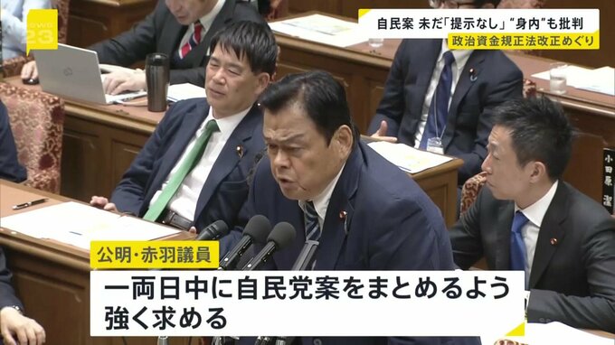 国会で岸田総理に厳しく迫ったのは、与党公明党の赤羽議員です。政治資金規正法の改正をめぐり、各党が改正案を取りまとめる中、自民党だけがまとまらない状況に苦言を呈しました。