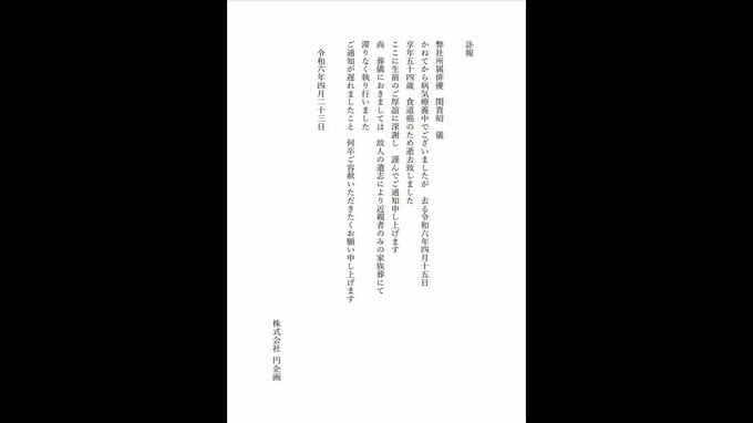 所属事務所の発表によると「かねてから病気療養中でございましたが 去る令和六年四月十五日 享年五十四歳 食道癌のため逝去致しました ここに生前のご厚誼に深謝し 謹んでご通知申し上げます(原文ママ)」と言うことです。