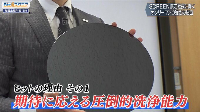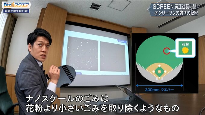 ゴミはインフルエンザウイルスより小さいナノサイズ。ナノメートルは1メートルの10億分の1。このウエハーが(直径)30センチ。これを野球場の大きさにすると、ナノスケールのごみは花粉より小さいごみを取り除くようなもの。(処理スピードは?)「作る前に作る」というコンセプトでシミュレーションして設計を最適化した。