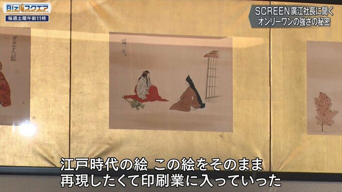 (会社は)元々、絵描きだった。江戸時代の絵。この絵をそのまま再現したくて印刷業に入っていった。(同じ絵を何枚も作って売りたいと)海外から印刷技術を導入して石版印刷という技術を入れたがそれが「パターンニング」の技術。(石版の)表面にインクが載りやすい液で絵を描き周りに水を含ませ、水から弾いたインクが先ほど描いた上に載る。「表面改質」表面を改質することで、インクを転写する技術がオリジナル。