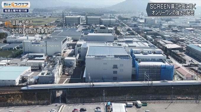名神高速道路や東海道新幹線が通る、琵琶湖東岸に位置する滋賀県彦根市。東京ドーム4.5個分の敷地に5棟からなる工場群。洗浄装置をはじめ、大部分はここで製造されている。最寄り駅の近江鉄道多賀線、その名も「スクリーン駅」。約3000人の従業員の通勤の便宜を考え、駅舎は工場の敷地内に設けられている。