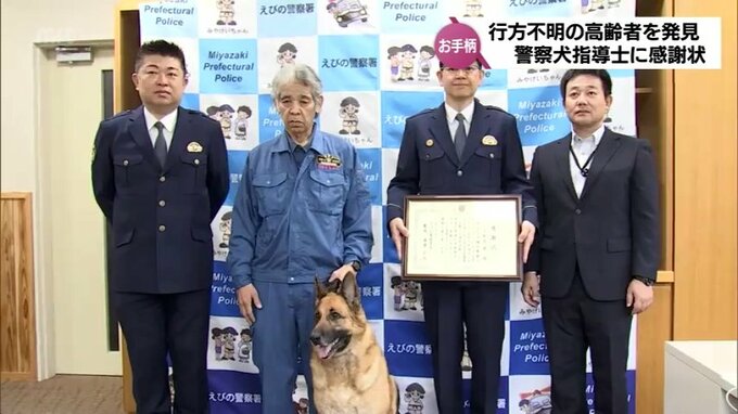 宮崎県えびの市で行方が分からなくなっていた高齢者の女性を早期に発見し、無事保護したとして、警察犬指導士の男性に感謝状が贈られました。感謝状が贈られたのは、小林市の警察犬指導士、宇都宮 豊さんです。23…
