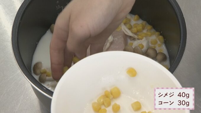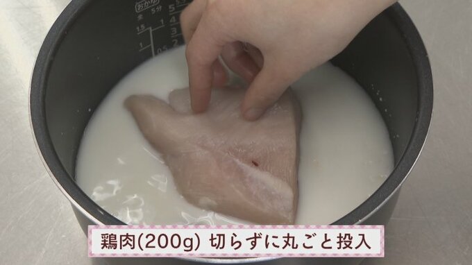 200mlの牛乳1パック、固形コンソメ、鶏肉は細かく切らずに丸ごと投入しましょう。