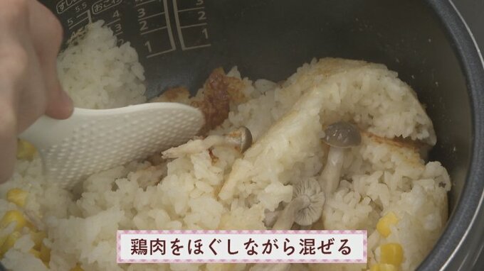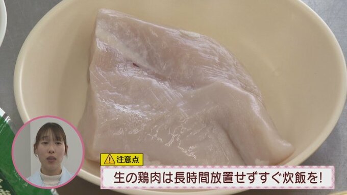 「生の鶏肉は食中毒のリスクがあるので炊飯器の中に長時間放置するのは避け、すぐに炊き始めてください」