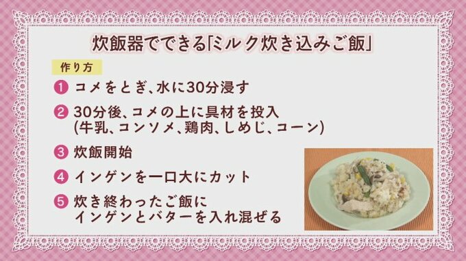 新生活応援!簡単レシピ① 「ミルク炊き込みご飯」 山梨学院短大の学生が考案 テレビ山梨 2024年4月23日(火) 18:14 国内 ~材料&分量~ コメ2合(300g)、水150ml、鶏むね肉200g、シメジ40g、 コーン(冷凍)30g、インゲン(冷凍)30g、固形コンソメ2個、 バター(2個)16g、牛乳200ml