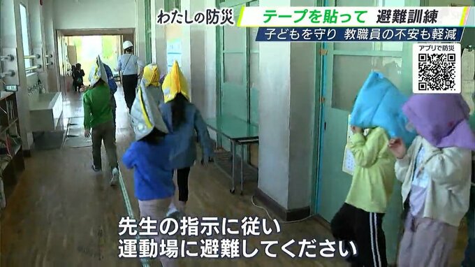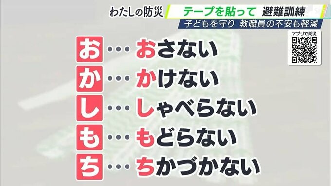 新たにテープが貼られた校舎で訓練をした児童たち。「おかしもち」の約束を意識し避難開始からおよそ5分でグラウンドに逃げることができました。