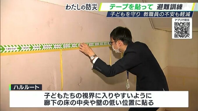 素材の種類や厚みも工夫されています。今後は、子どもたちにもテープを貼ってもらい、避難ルートを学んでほしいと考えています。