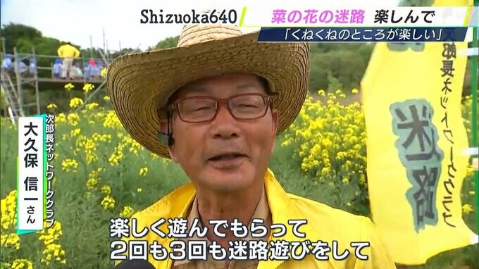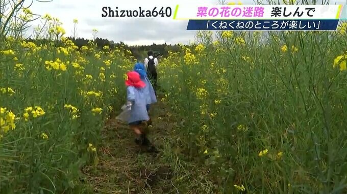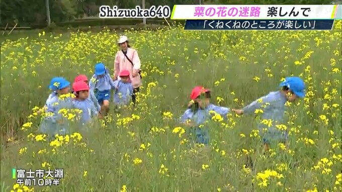 菜の花に囲まれながら探検を楽しむ子どもたち。富士市大淵に作られた菜の花の迷路です。この迷路は、富士市で農地の保全などに取り組む団体が多くの人に美しい景観を楽しんでもらおうと作りました。