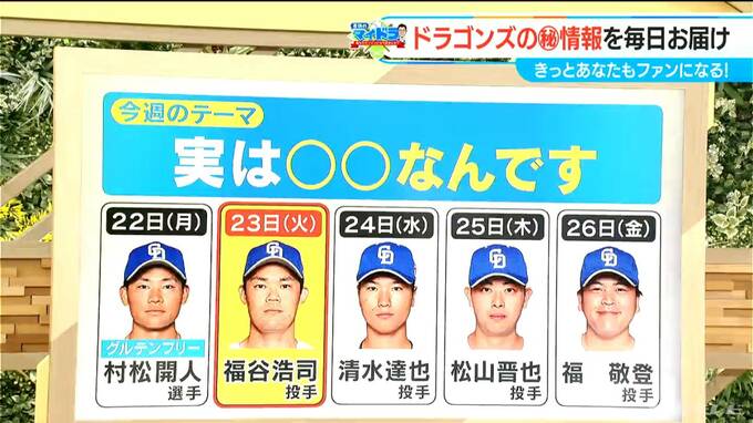 「実はこんなことをしています」「実はこんなことをしていました」など、ドラゴンズ選手の知られざるエピソード秘話をご紹介します。きのう(4月22日)は、村松開人選手で「実はグルテンフリー始めていました」というお話でした。きょう(23日)は、福谷浩司選手です。