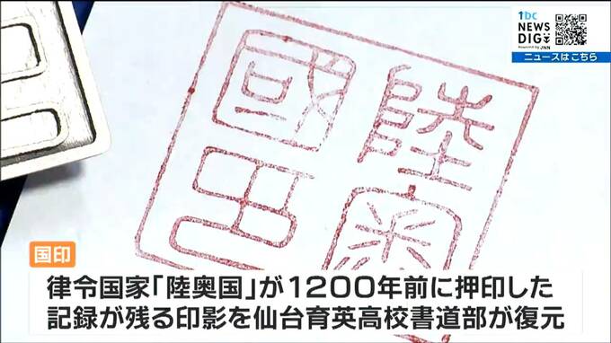 この国印は、東北に存在した律令国家「陸奥国」が1200年前に押印したとの記録が残る印影を、仙台育英高校書道部が復元。