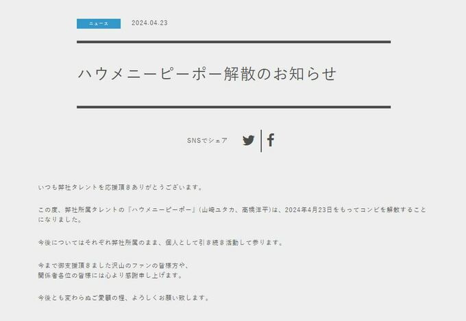 発表によると「この度、弊社所属タレントの『ハウメニーピーポー』(山崎ユタカ、高橋洋平)は、2024年4月23日をもってコンビを解散することになりました。」とし、今後については「それぞれ弊社所属のまま、個人として引き続き活動して参ります。」と、しています。