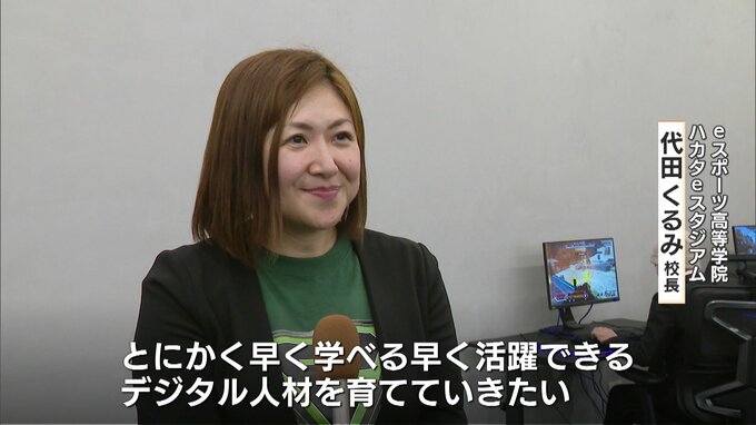 eスポーツ高等学院 ハカタeスタジアム 代田くるみ校長「中学校の時に学校に行けなかった、学校と距離があるという生徒もいます。生徒たちがとにかく家から出てくるというところをサポートしていきたいと思っております。eスポーツに関すること、これまでであれば高校を卒業してから専門学校や大学に行って専門的に学ぶということになっていましたが、とにかく早く学べる、そして早く活躍できるデジタル人材を育てていきたいと思っています」