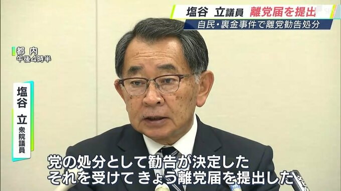 自民党派閥の裏金事件をめぐり、離党勧告の処分が確定した安倍派の塩谷立衆議院議員が4月23日、離党届を提出し、受理されました。