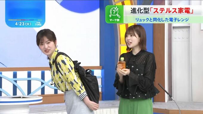 スタジオでは、TIMEマーケティング部の原部員が電子レンジ機能を搭載したリュックサックを紹介。(「ウィルクック パッカブル」19,750円から)