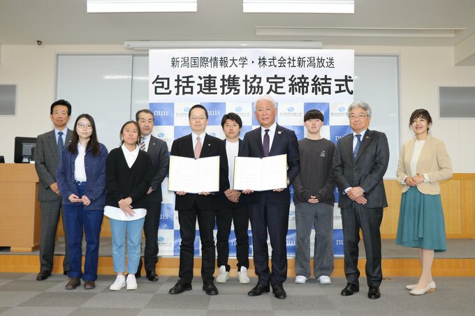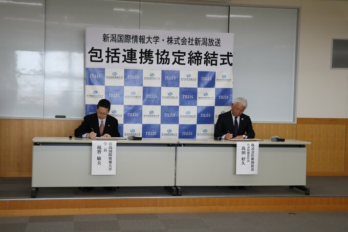 新潟市西区の新潟国際情報大学で行われた締結式には、越智敏夫学長と新潟放送の島田好久社長が出席し、協定書に署名しました。
