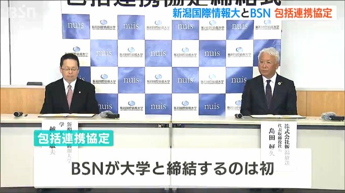 新潟市西区の新潟国際情報大学で23日に行われた締結式には、越智敏夫学長と新潟放送の島田好久社長が出席し、協定書に署名しました。BSNが大学と連携協定を結ぶのは初めてです。