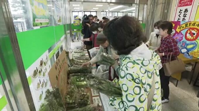 能登応援プロジェクトとして産直市を開いたのは、JA金沢中央の戸板、三馬、大徳の3つの支店です。店頭には能登で採れたばかりのアスパラガスやシイタケのほか、ワラビやセリ、山ウドといった山菜が並びました。
