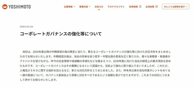 吉本興業が公式サイトを更新。「コーポレートガバナンスの強化等について」と題した文書を公表しました。