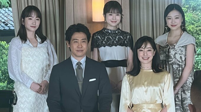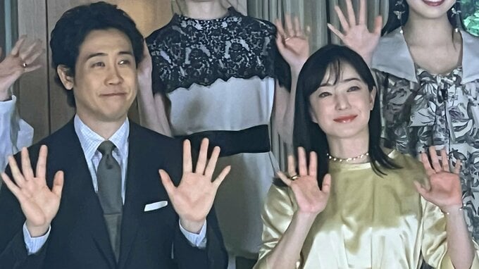 俳優の大泉洋さん、菅野美穂さん、福本莉子さん、川栄李奈さん、新井美羽さん、月川翔監督が24日、明治記念館で行われた映画「ディア・ファミリー」の家族決起会見に登場しました。
